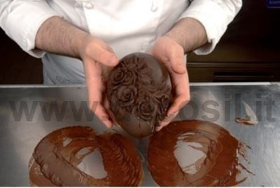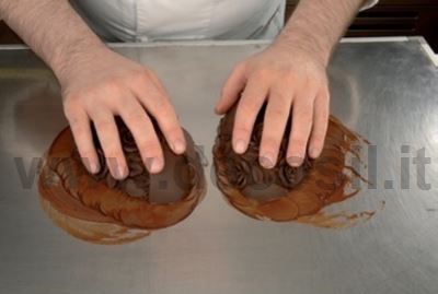 Égoutter le chocolat en plaçant le moule sur une plaque à pâtisserie recouverte de papier cuisson. Appuyer légèrement sur le thermoformée pour faire coller et laisser reposer pendant quelques minutes dans la celle de refroidissement rapide. Cette procédure permettra à la formation d’un «pied» de renforcement sur les bords de l’oeuf du chocolat, le démoulage sera donc plus facile.