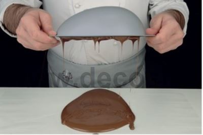 Remplir le moule de chocolat pré-cristallisé, vibrer, pour éviter la formation de bulles d’air, laisser reposer. Après cristallisation de la première couche de chocolat, vider le moule du chocolat en excès.